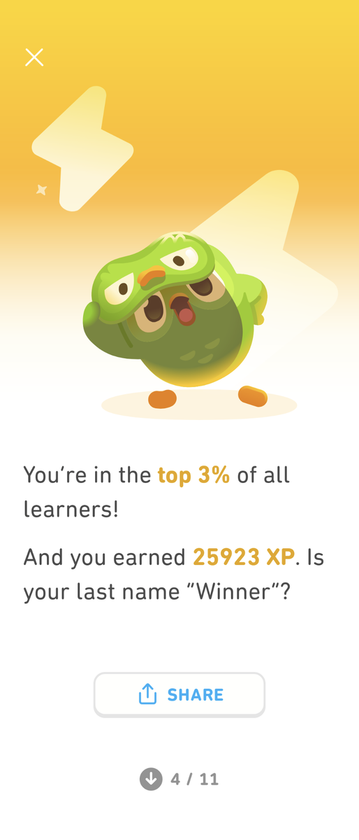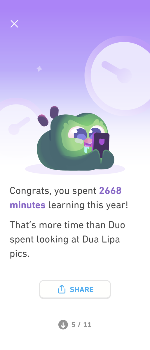 Duolingoは勉強するとゲームのようにExp(Experience、経験値)がもらえるのですが、その今年の合計が「25923XP」でそれは全学習者の上位「3%」に入るらしいです!!ちなみに娘は上位2%で負けました😭学習時間は「2668分」とのことなので44時間くらい?毎日短い時は数分からの積み重ねで44時間。多いのか少ないのかわからないな😂